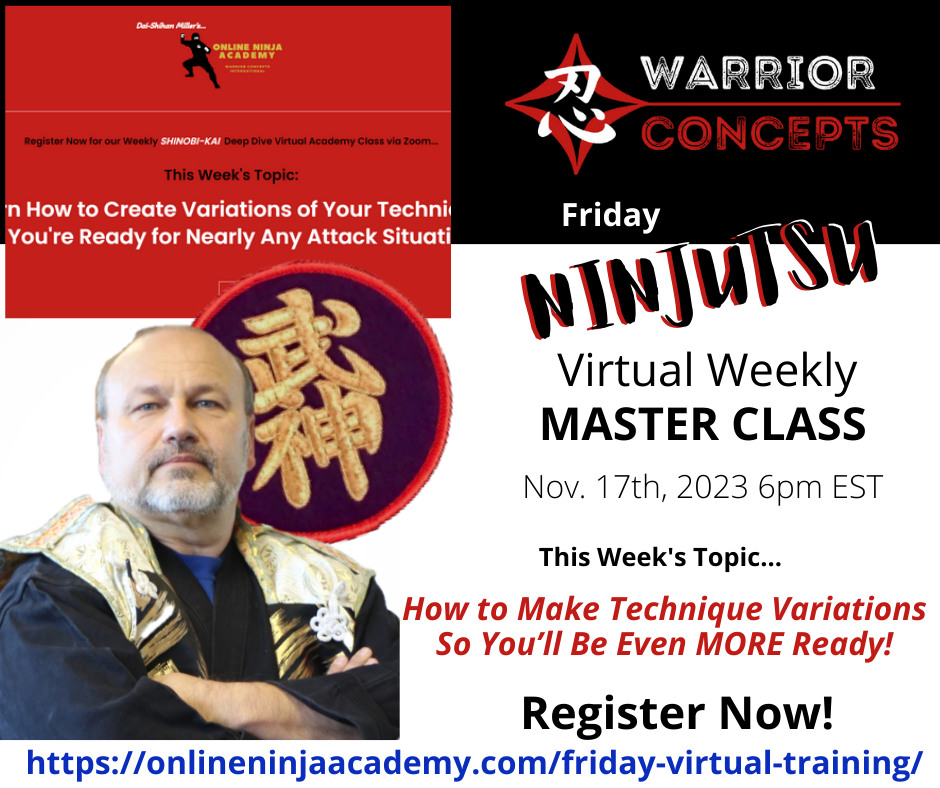 There's still time to register for tomorrow's virtual Ninjutsu self-defense class via Zoom which will be based on this lesson. During this class you're going to learn techniques, tactics, and strategies for going beyond what everyone else is doing, to having a level of power, confidence, and control that makes most black belts look like beginners. That's not hype... that's fact!