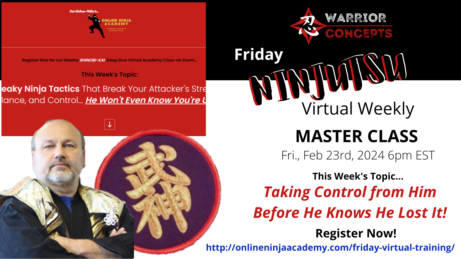 Here's the link to register for week's virtual Ninjutsu class via Zoom, tonight at 6pm eastern where I'll be showing you how to actually do this with your techniques and physical skill sets, based on this exact lesson.