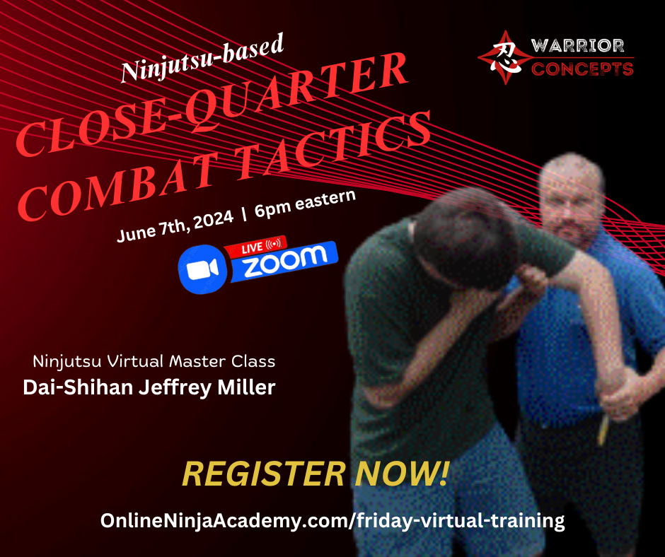 Here's the link to register for this week's virtual Ninjutsu class from my dojo via Zoom, Tonight at 6pm eastern, where I'll be teaching on several of the lessons taught during this week's Warrior's Whiteboard Wednesday, and what this can look like in an actual engagement with an attacker under different conditions!