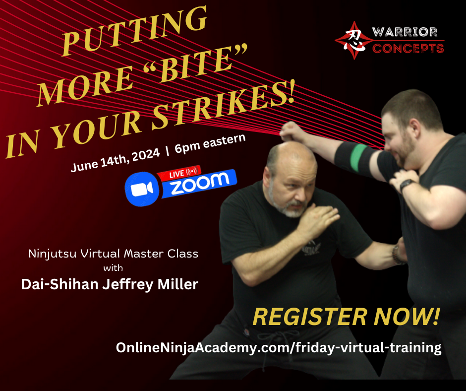 Here's the link to register for this week's virtual Ninjutsu class from my dojo via Zoom, tonight at 6pm eastern, where I'll be teach several techniques that demonstrate what I taught during this week's Warrior's Whiteboard Wednesday.