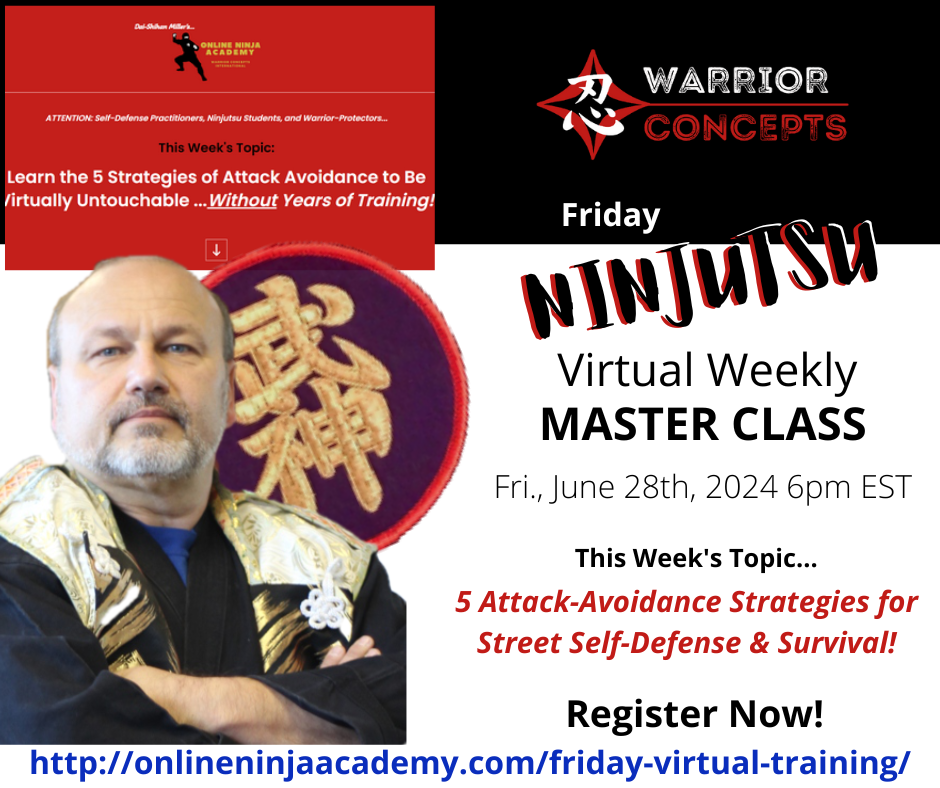 If you're looking to do everything you can to become "untouchable" by the attacker looking to beat, break, or worse to you, and to master the fundamental skill of avoiding incoming punches, grabs, and kicks in a way that get's you out of the "take-one-to-get-one, trading shots mentality...then today's Friday Ninjutsu Virtual Class will be perfect for
