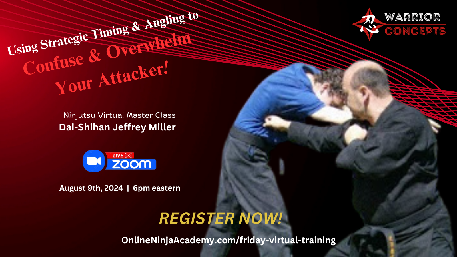Here's the link to register for this week's virtual Ninjutsu class from my dojo via Zoom, tomorrow evening, August 9th at 6pm eastern, where I'll be leading students like you