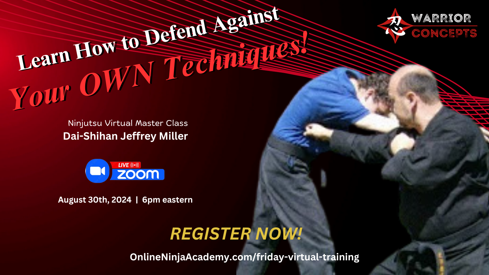 Ninjutsu class from my dojo via Zoom, this evening, August 30th at 6pm eastern, where my senior ranking black belt student, Shidoshi Jason Whistler will be leading students like you through several of the basic models that will allow you to be able to protect yourself should your attacker do those moves on you!