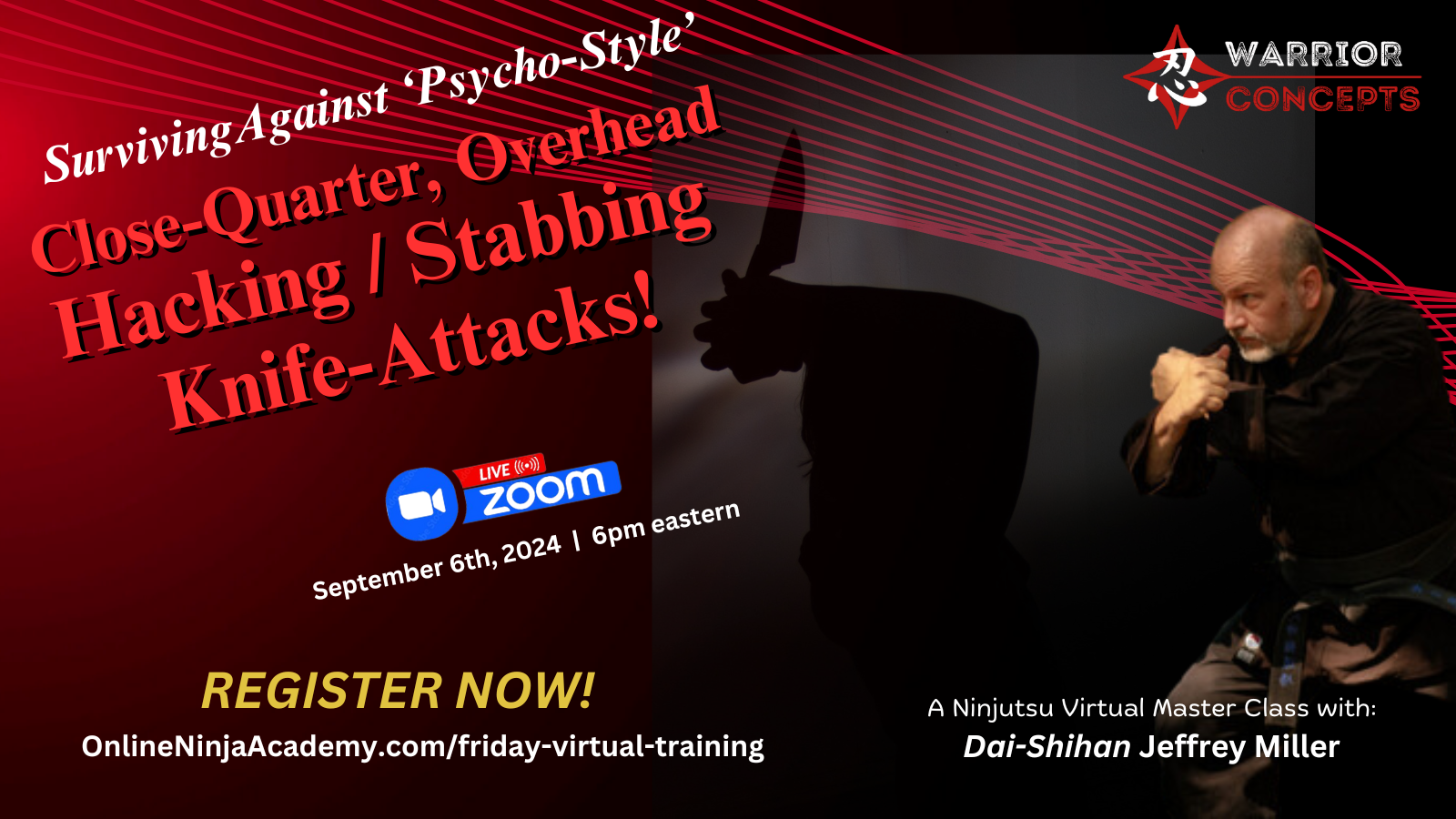 Here's the link to register for this week's virtual Ninjutsu class from my dojo via Zoom, TODAY, September 6th at 6pm eastern, where I'll be teaching