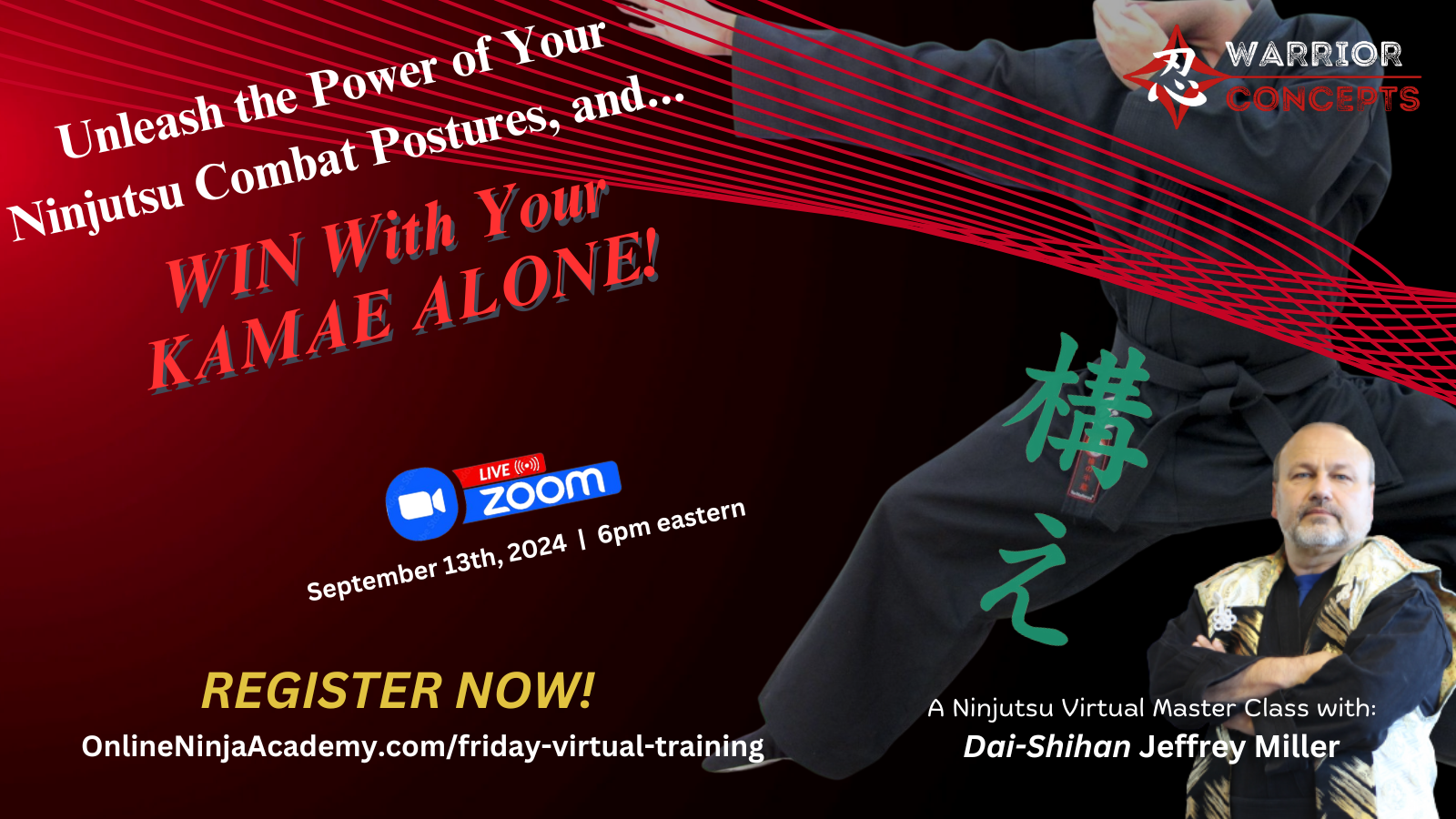 Here's the link to register for this week's virtual Ninjutsu class from my dojo via Zoom, tomorrow evening, September 13th at 6pm eastern, where I'll be teaching techniques that show how much further our Ichimonji no Kamae can take you!