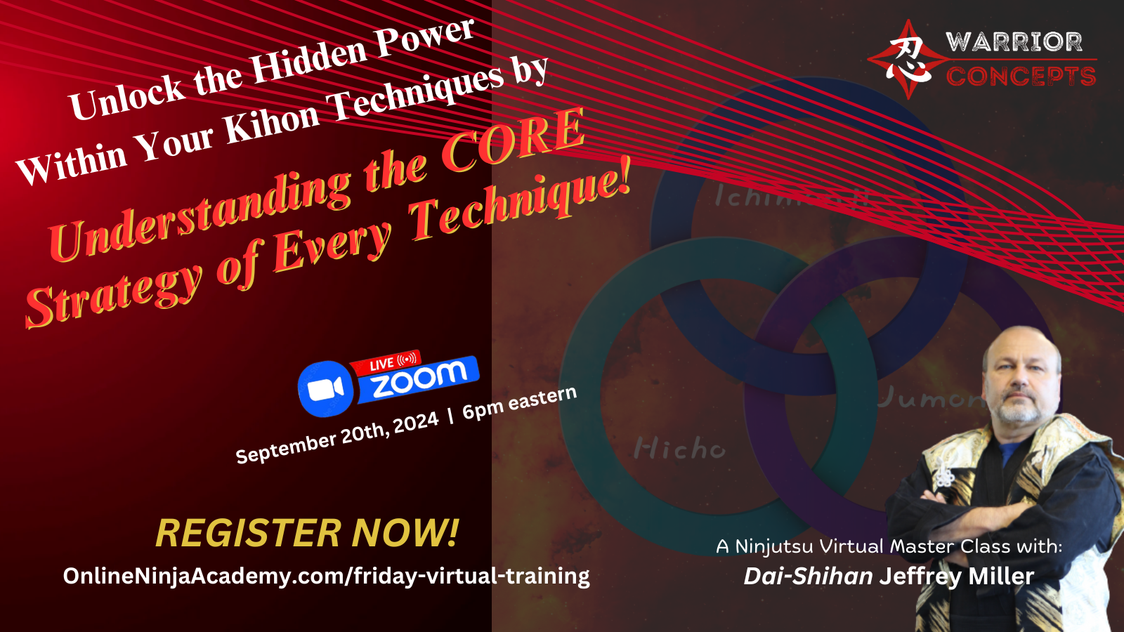 Here's the link to register for this week's virtual Ninjutsu class from my dojo via Zoom, this evening, September 20th at 6pm eastern, where I'll be leading students like you through these technique examples with an eye on several of the aspects I covered.. and MORE! (This is important stuff... if you're focus is on learning more than just kata and