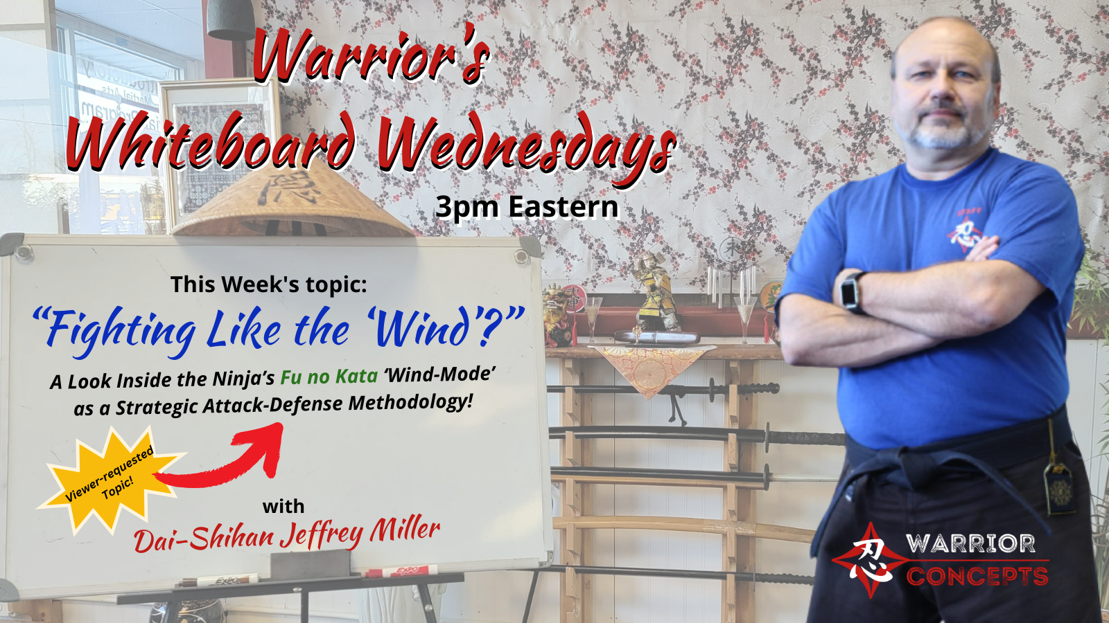 This week's topic is based on a viewer request. Â We'll be exploring the concept of "Fighting Like the 'Wind,'" what that means and several aspects that this idea points to in some circles of Ninjutsu training. Â Remember... We simulcast live on several platforms... today at 3pm eastern. Â So...