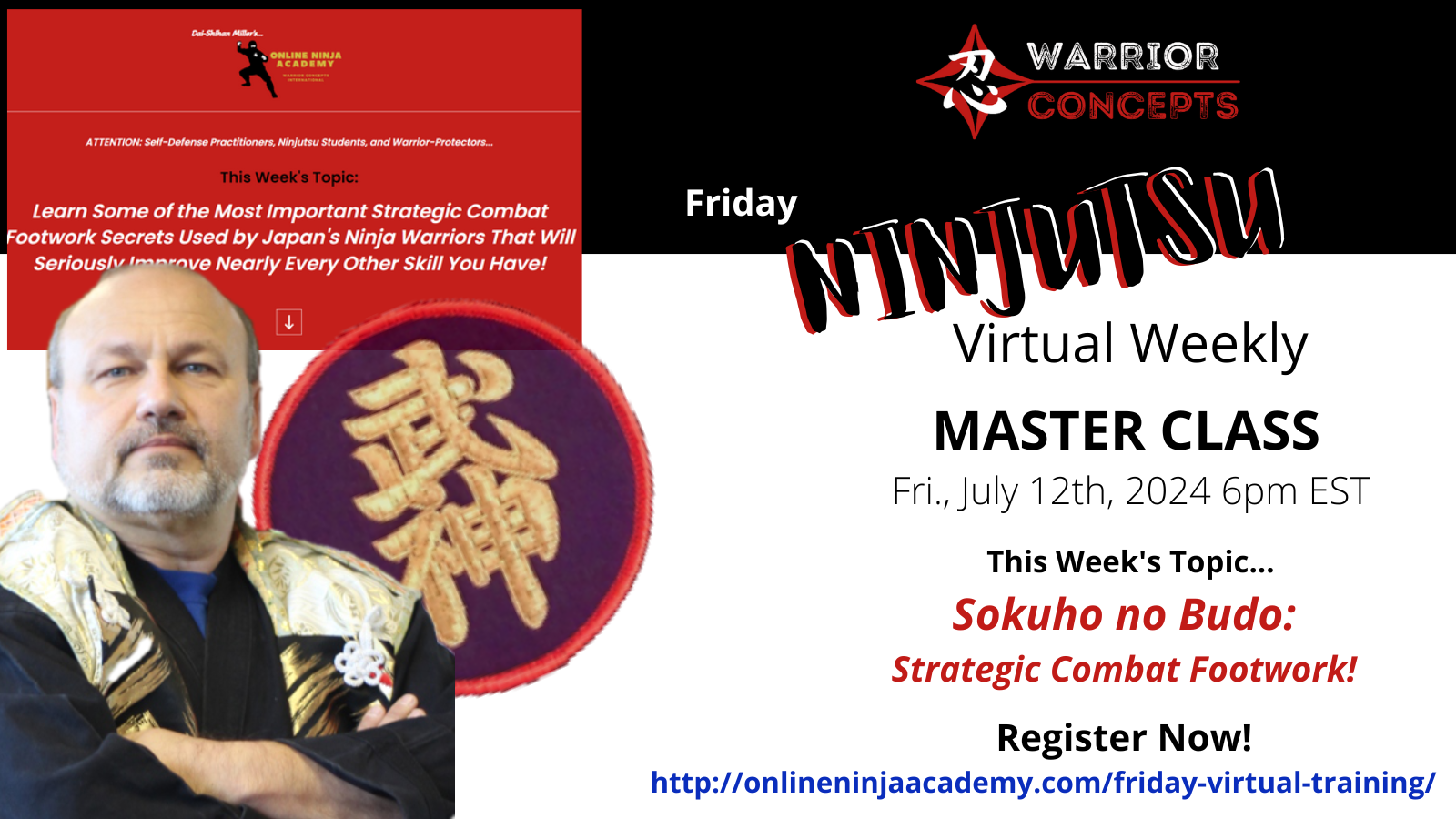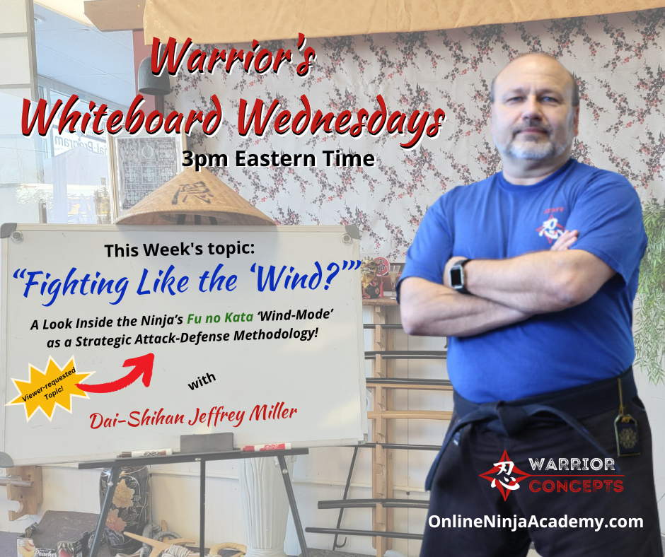 Here's the link to register for this week's virtual Ninjutsu class from my dojo via Zoom, tomorrow night, July 12th at 6pm eastern, where I'll be demonstrating several techniques and examples of what several of these strategies could look like in an actual