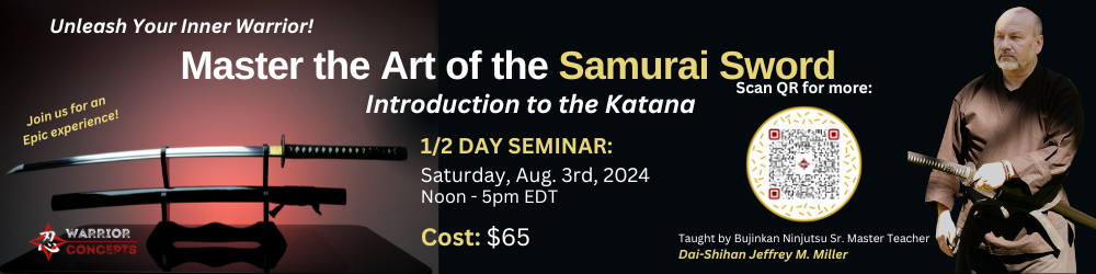 I'm inviting you to join me for a special introductory seminar designed to teach you the foundations of the Katana - the famous sword of the Samurai and Ninja of ancient Japan. Unleash your inner-warrior and feel the power of one of the deadliest and mystical weapons ever invented by man!