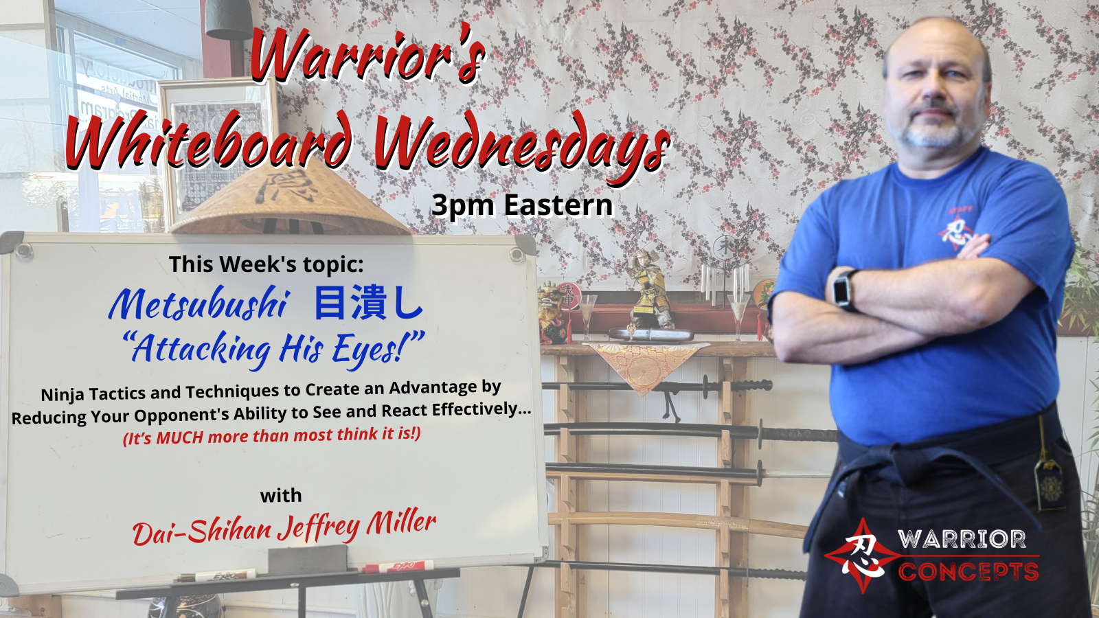 This week, we'll be looking exploring several tactics for attacking your assailant's eyes(Metsubushi), and taking advantage of the mental gaps and delayed perceptual processing they cause. Â Remember... We simulcast live on several platforms... today at 3pm eastern. Â So...