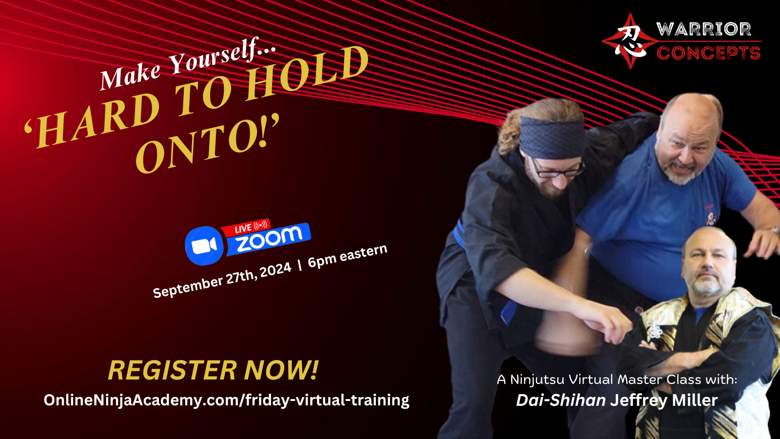 Here's the link to register for this week's virtual Ninjutsu class from my dojo via Zoom, this evening, September 27th at 6pm eastern, where I'll be leading students like you through technique examples with an eye on one of these 3 critical aspects I covered.. and MORE! (This is important stuff... if you're focus is on learning more than just kata and "cool Ninja moves" to impress your friends! 😎)