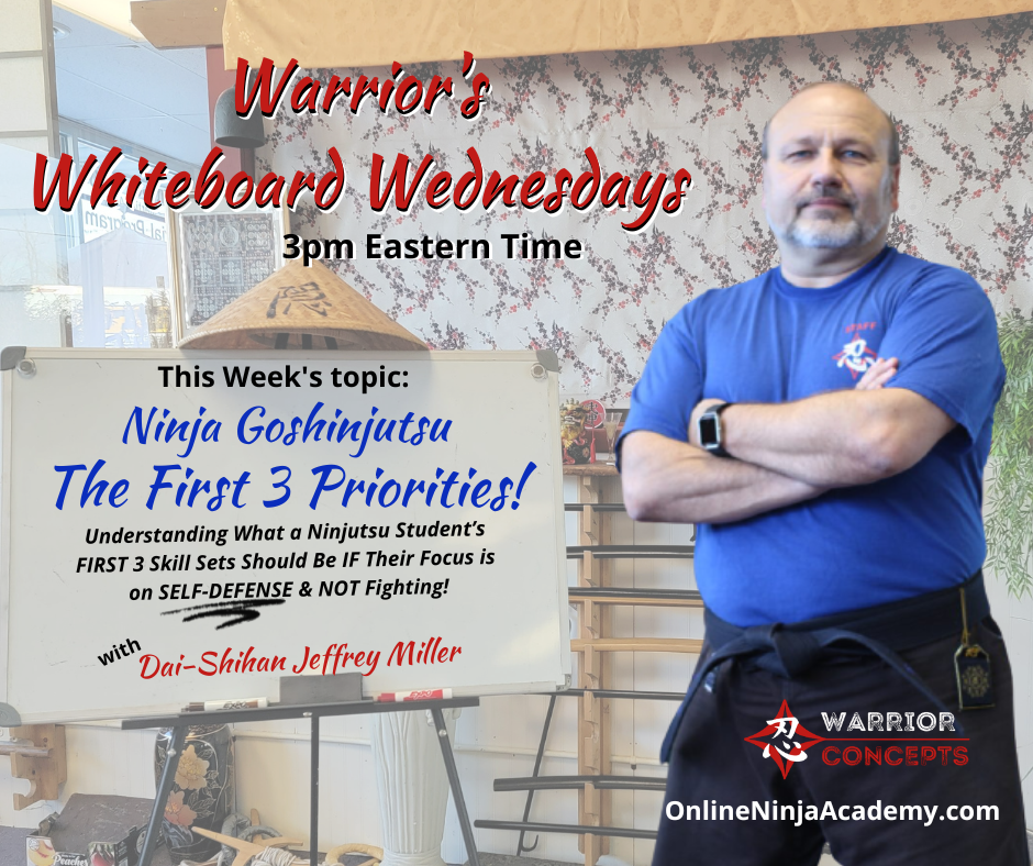 week's episode of Warrior's Whiteboard Wednesday where we looked at the 3 priority skill sets any serious, self-defense & survival-minded student should not only be learning, but MASTERING as quickly as possible - regardless of what it says in the scrolls, what other cool techniques there are to learn... or what any Tic Tak Do or Hong Kong Fu-ee goo-roo says. If you missed it, you can catch up here: Ninja Goshijutsu: 3 Priorities
