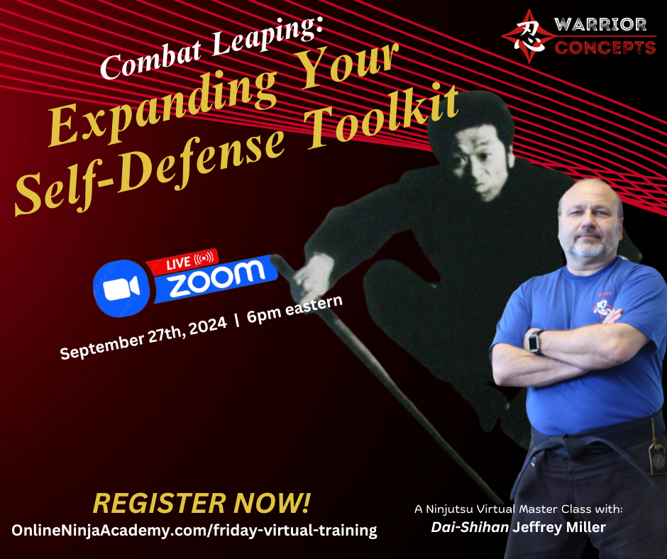 Here's the link to register for today's virtual Ninjutsu class from my dojo via Zoom, Tonight at 6pm eastern, where I'll be teaching techniques based on a few of the aspects of the lesson I taught during this week's Warrior's Whiteboard Wednesday, and how integrating your leaping skills into different aspects and other skill sets can drastically change your ability to