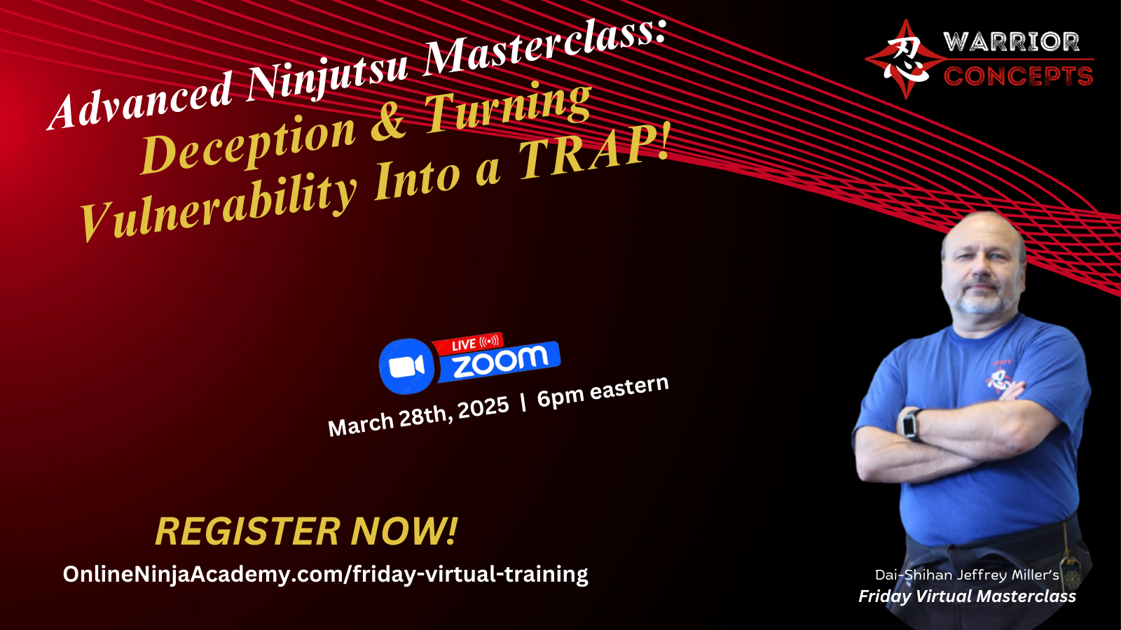 Here's the link to register for this week's virtual Ninjutsu class from my dojo via Zoom, tomorrow, March 28th at 6pm eastern.